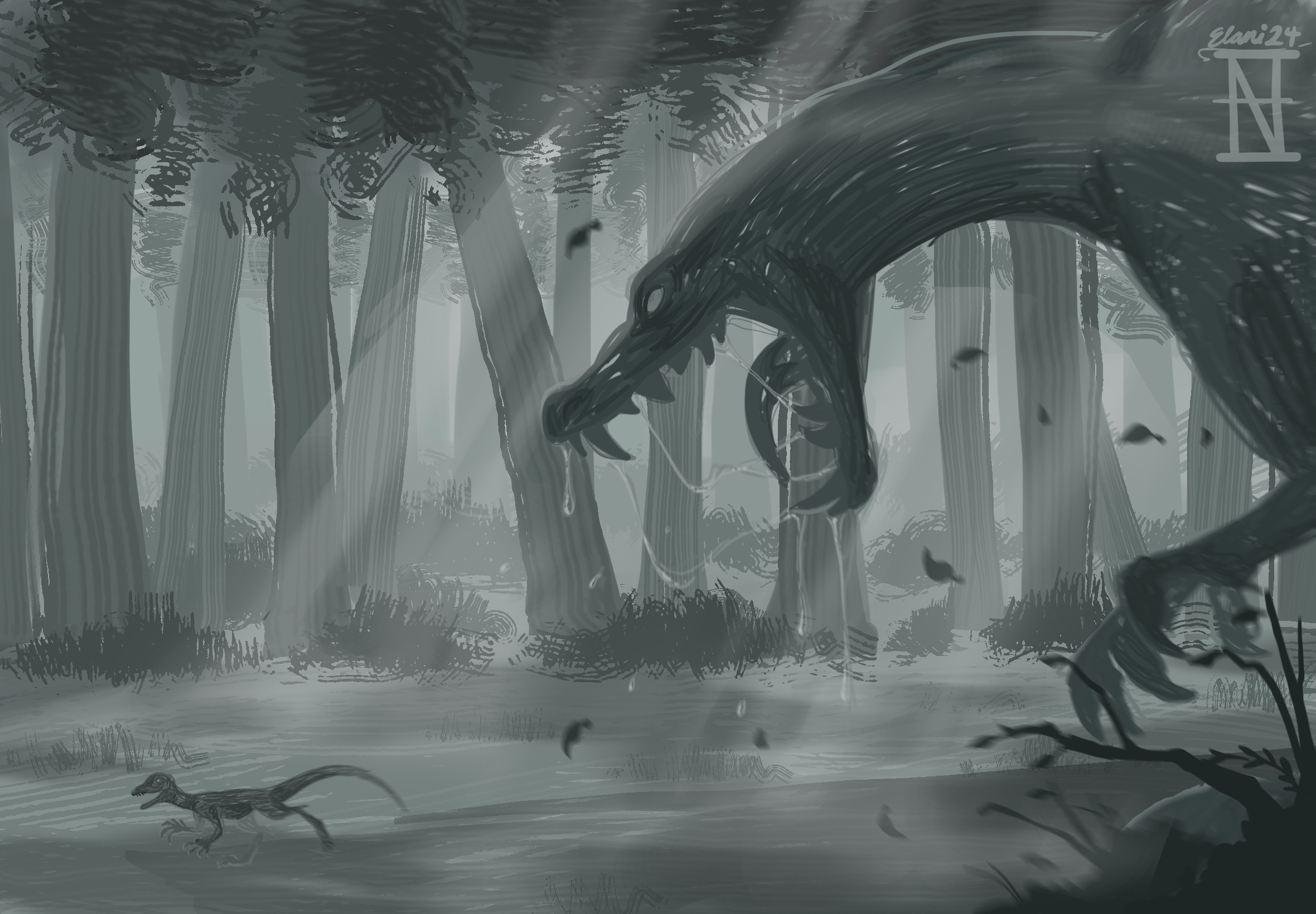 Description: Ambush was done during the course of a day. While learning about sine and cosine in my math class, I ended up doodling the little dinosaur in the bottom left corner on top of my notes. When the class was done, I continued drawing around the little guy. What was he running from? Why a hungry Spinosaurus of course. Where were they running? In a tall and mysterious oak forest. Just kept drawing, until I had this scene. All done in a «doodle/sketchy style» replicating the one I had used on the little dinosaur. I mostly focused on values for this piece. Making things that were closer darker, and things that were farther lighter. A very on and off piece of work but I think it turned out great.