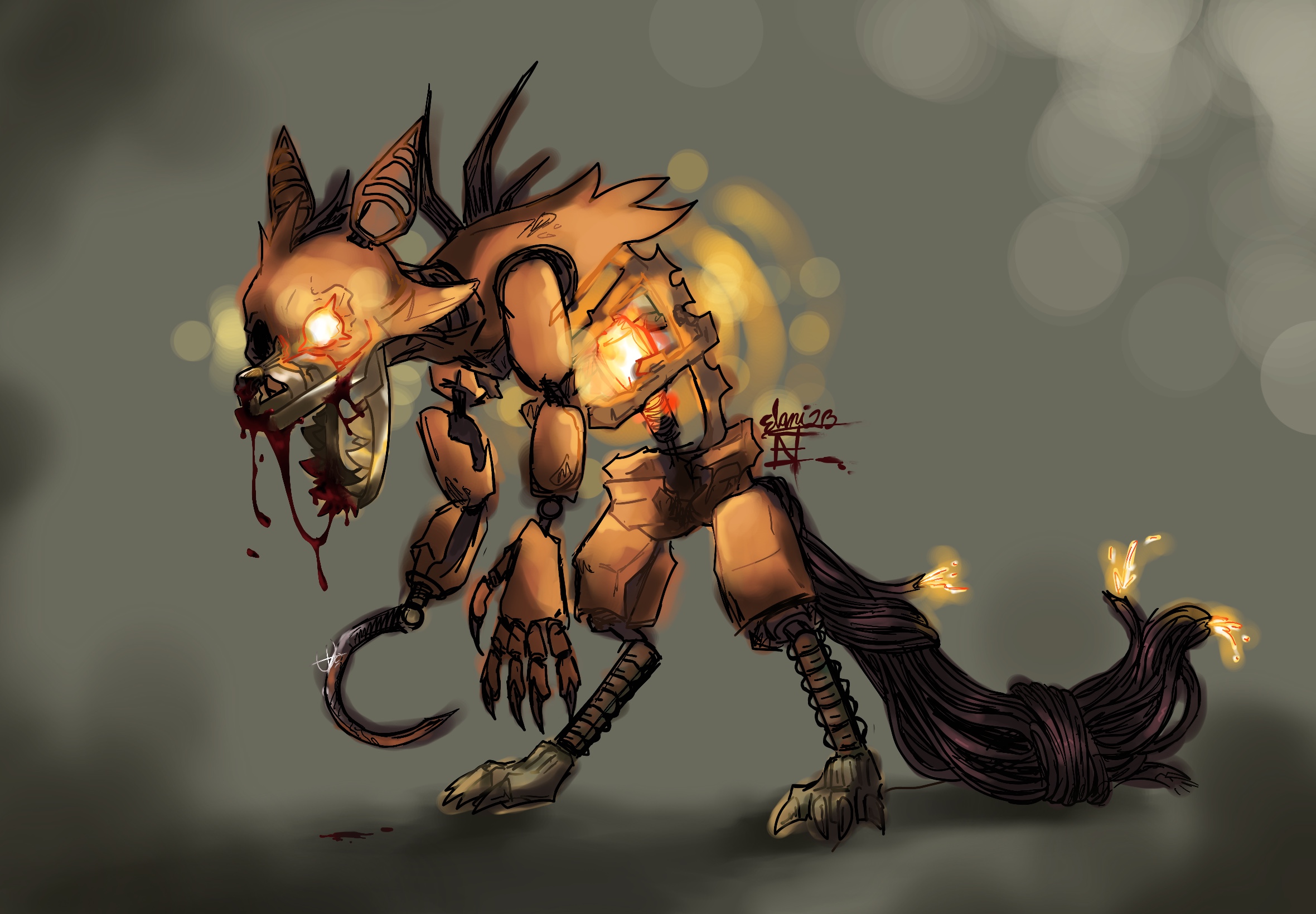 Description: I never got into Five Nights at Freddy’s when I was younger, even though my friends did. But I’ve grown to really love the franchise because of them. So, one day during a class break, a friend pulled out a Jack-o-lantern Foxy plush and asked me if I could draw it but in a more «real/animalistic» style. So I did a quick sketch and he loved it. I decided to color it, then shade it, and add glowing beams and sparks. When I was about to sign it, I realized I ended up liking it very much. It’s still one of my favorite pieces to this day, and when I look at it I just think of my friend.